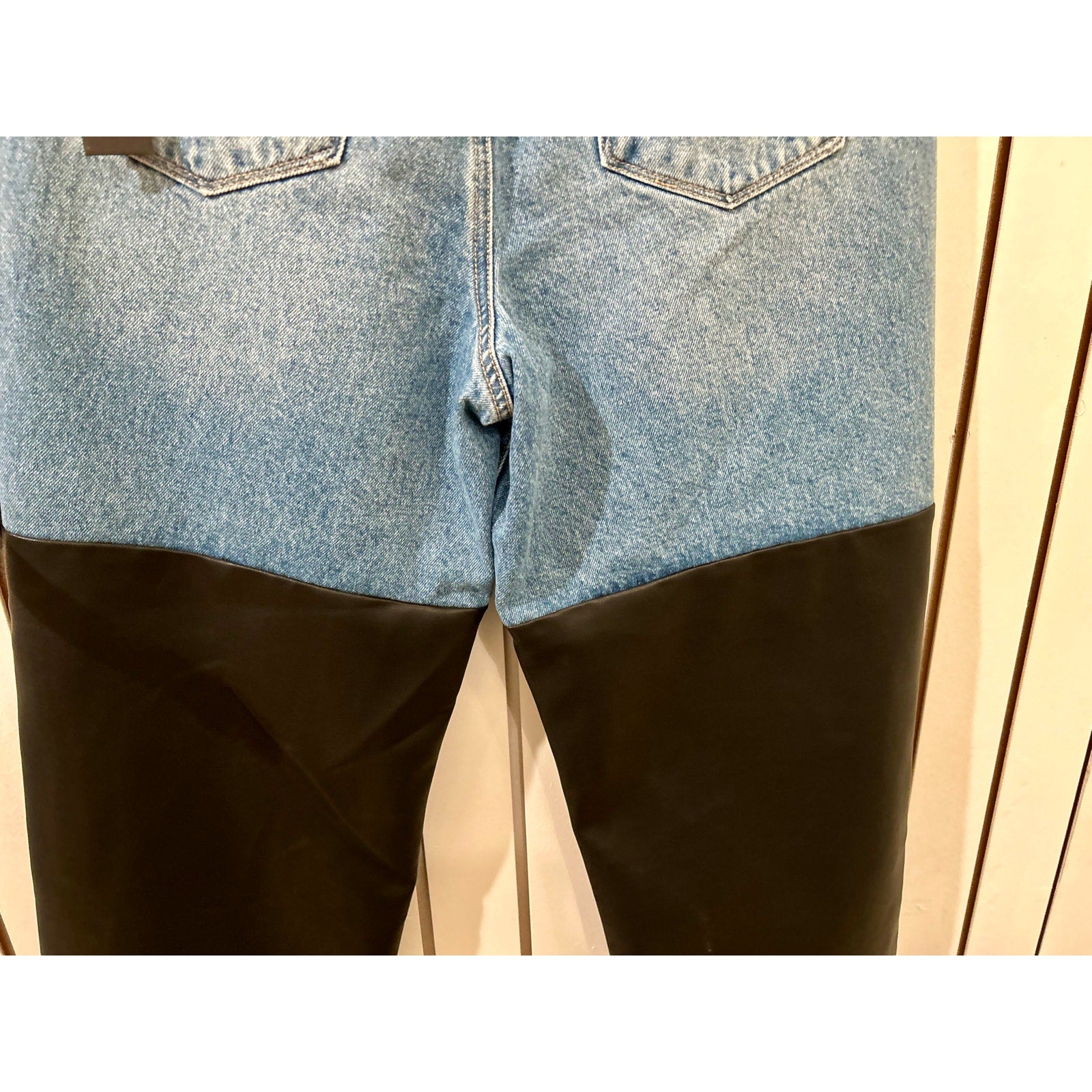 These Blank NYC jeans in size 29 feature a unique and bold design with faux leather bottoms and a wide-leg silhouette. The classic denim upper gives way to sleek, edgy faux leather at the hem, creating a stylish contrast that's perfect for making a statement. The wide-leg cut offers a comfortable, relaxed fit, while the faux leather adds a modern touch of sophistication. These jeans are perfect for dressing up or down, combining comfort and trend-setting style in one standout piece.