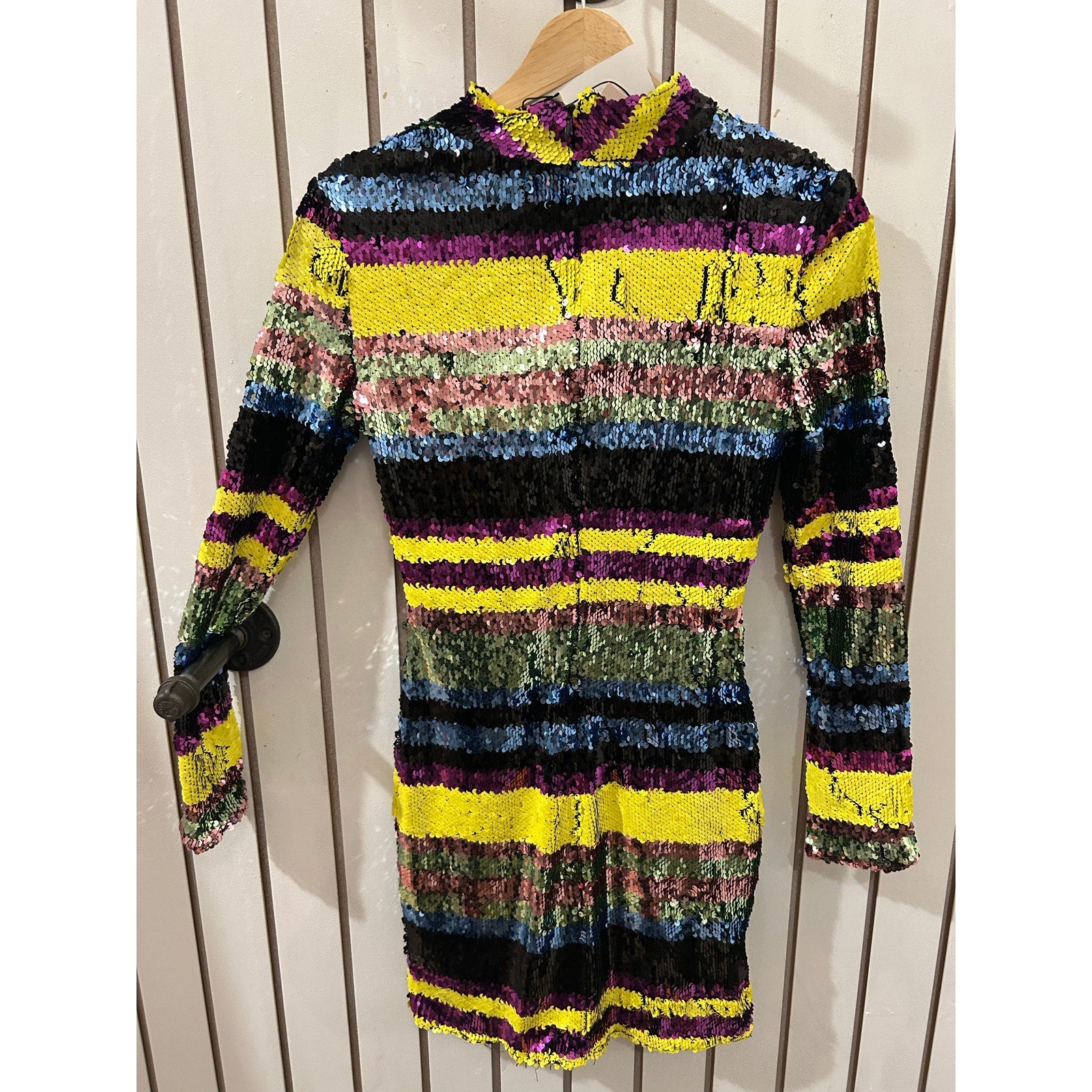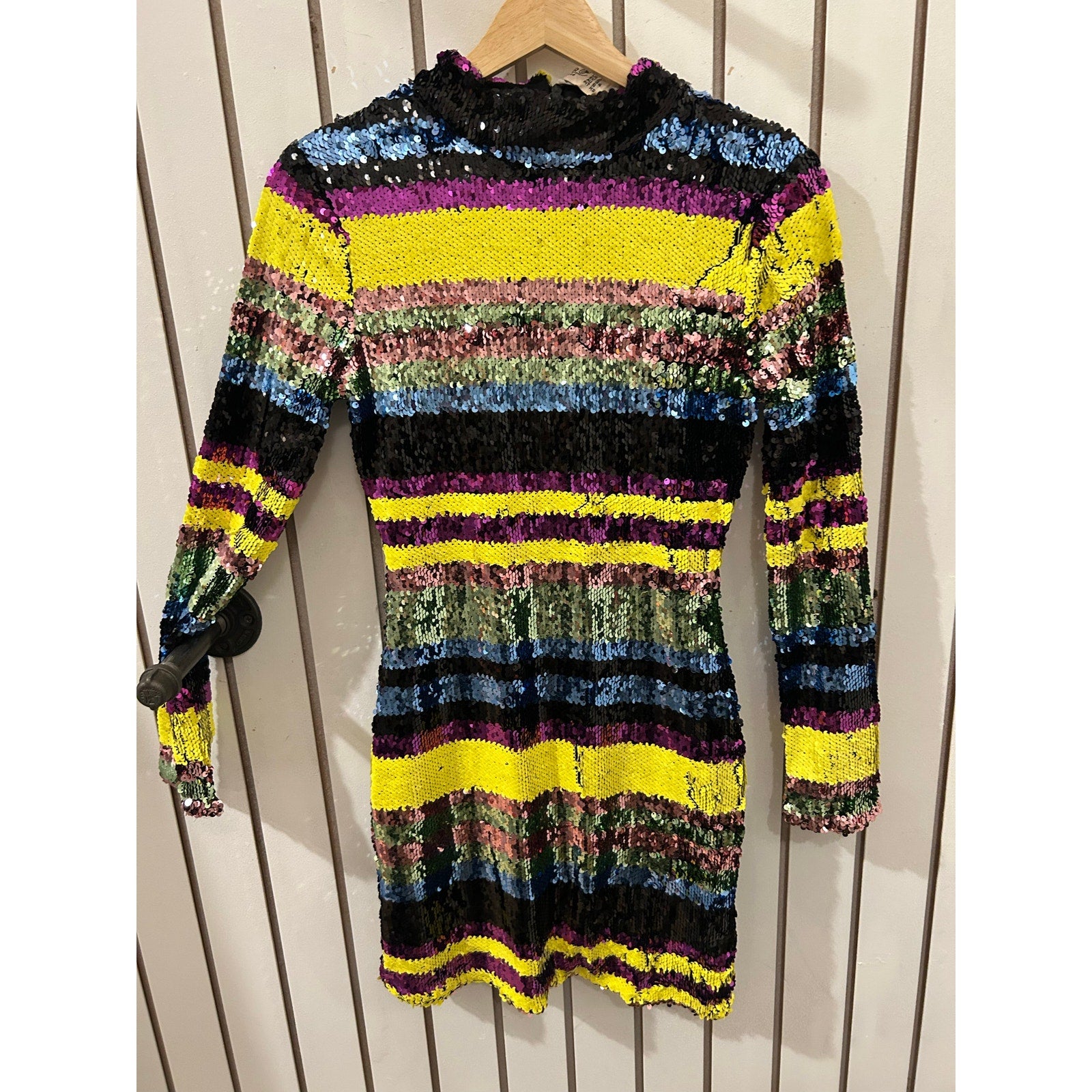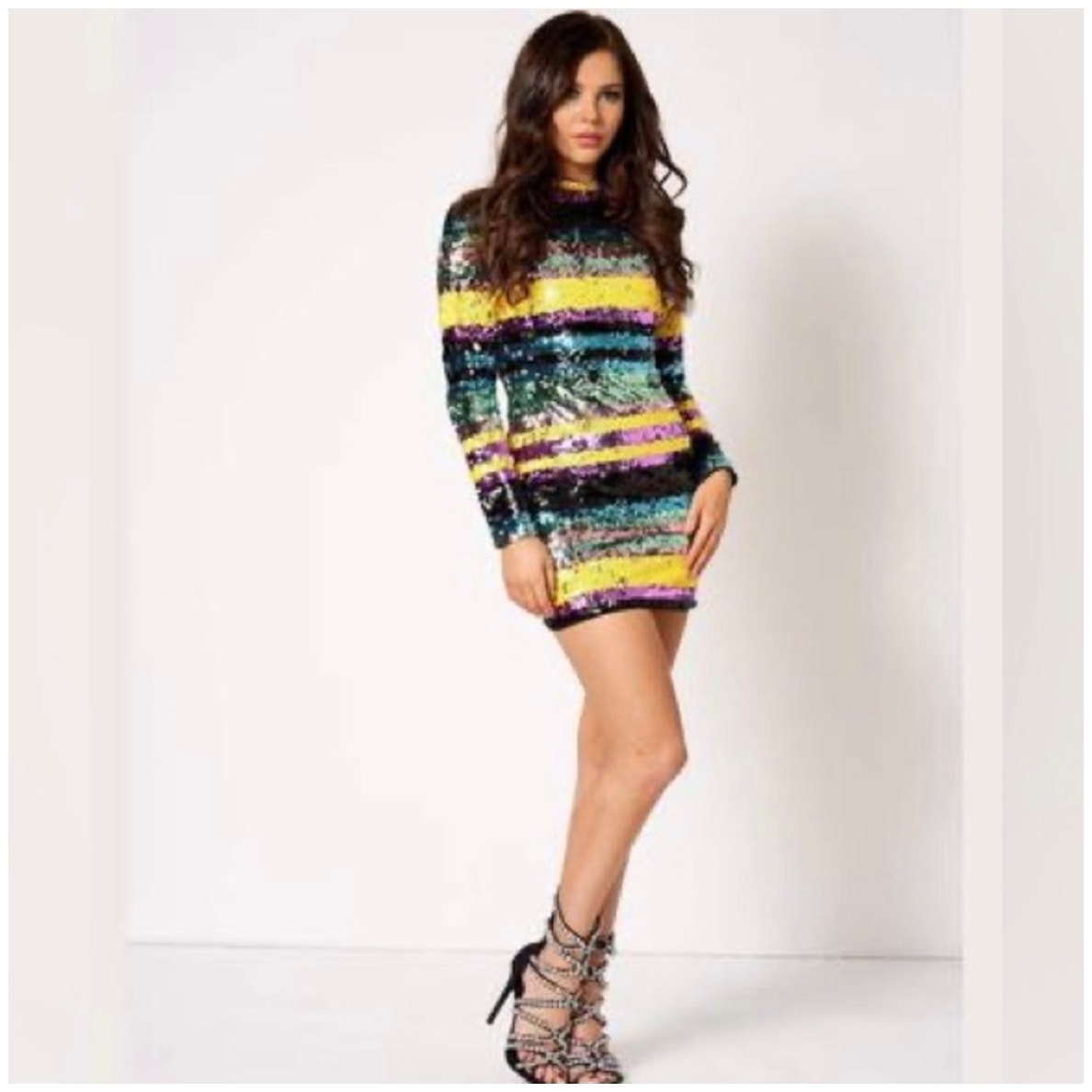 Bold and glamorous, this Club L London dress in size 2 features long sleeves and shimmering sequins in a striking blue, purple, yellow, and black stripe pattern. Perfect for parties, holiday events, or a night out, this dress is made to turn heads.