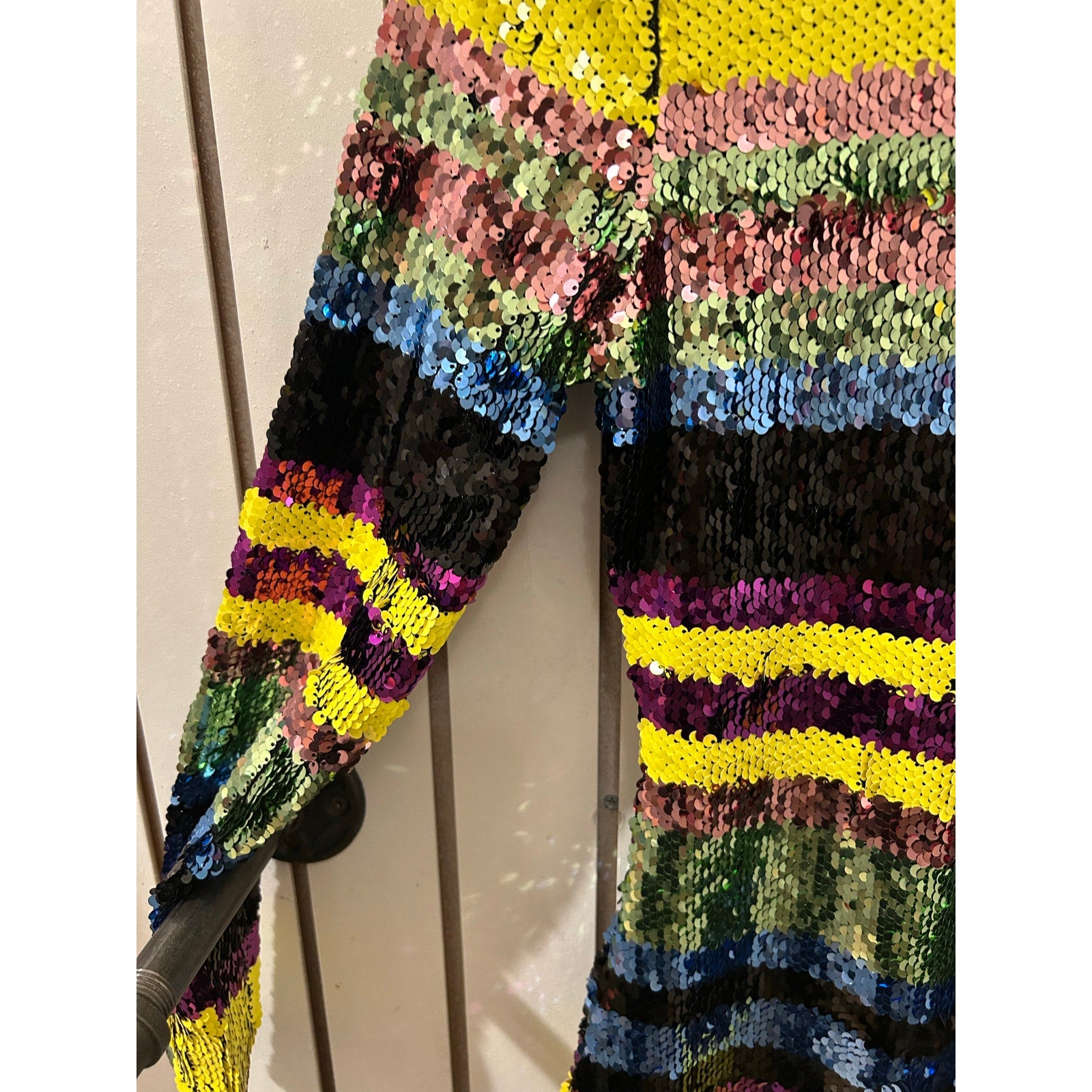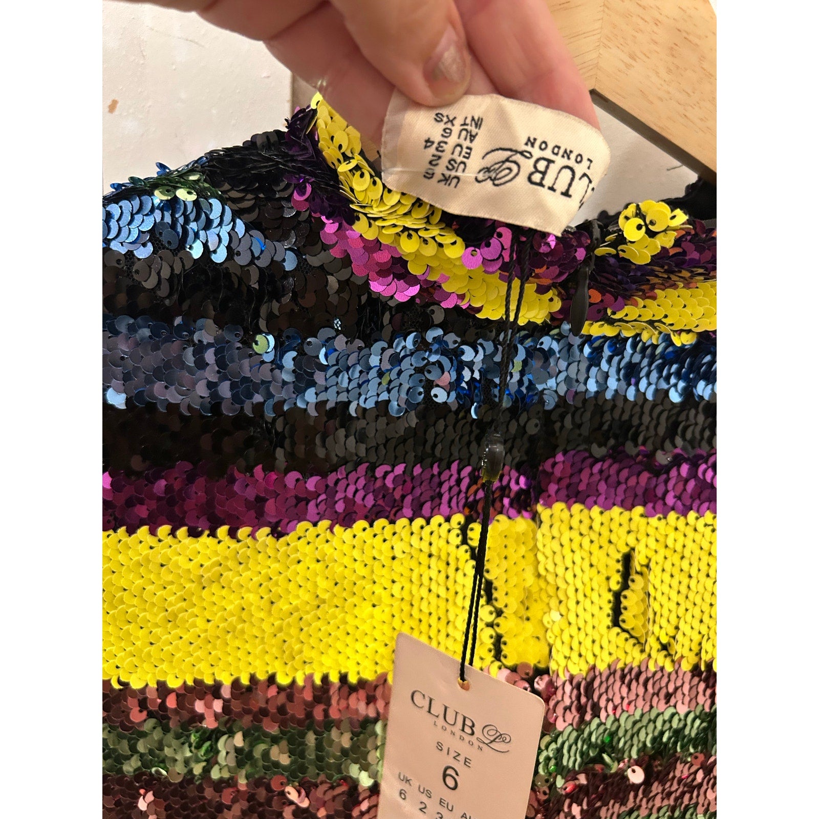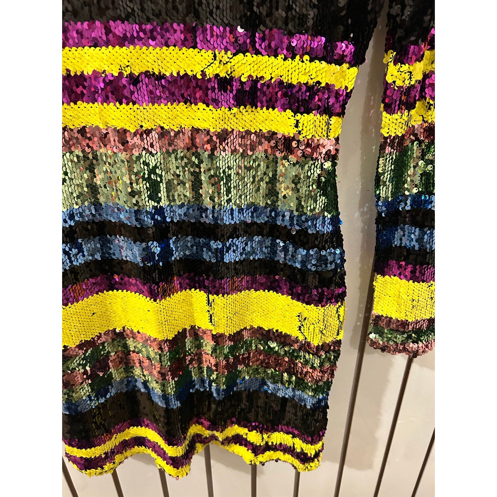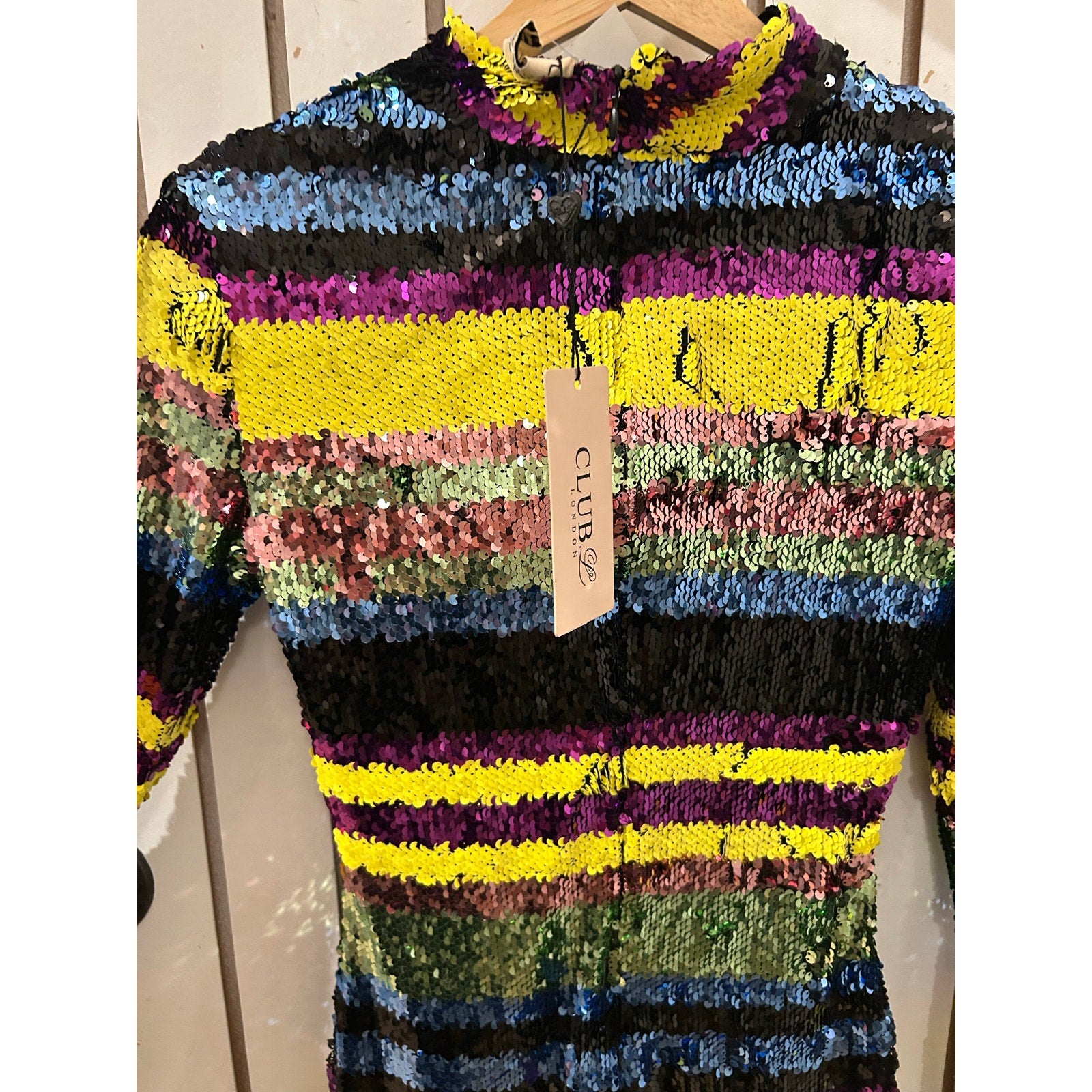 Bold and glamorous, this Club L London dress in size 2 features long sleeves and shimmering sequins in a striking blue, purple, yellow, and black stripe pattern. Perfect for parties, holiday events, or a night out, this dress is made to turn heads.