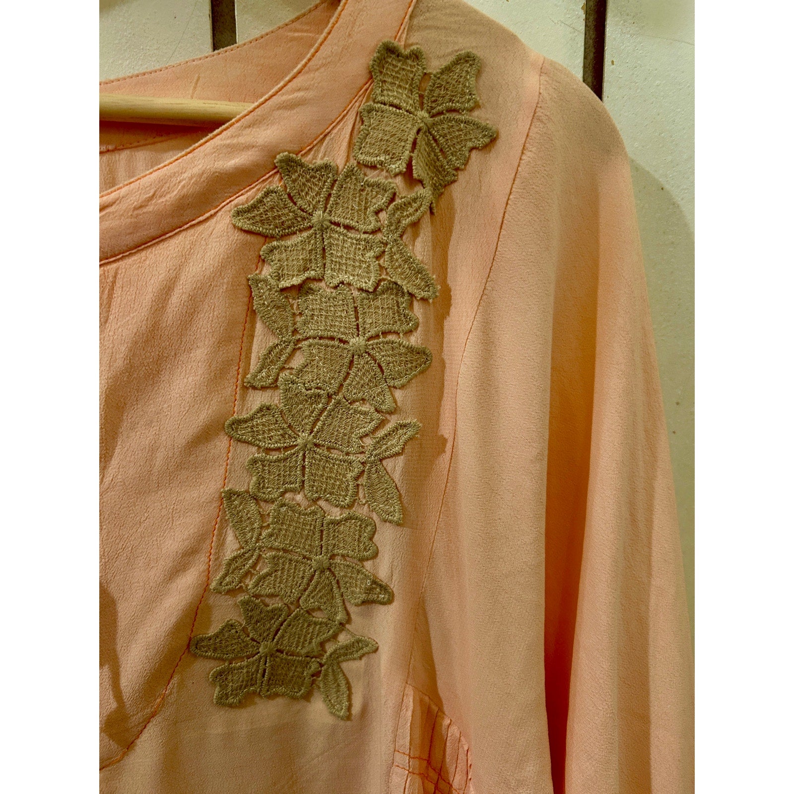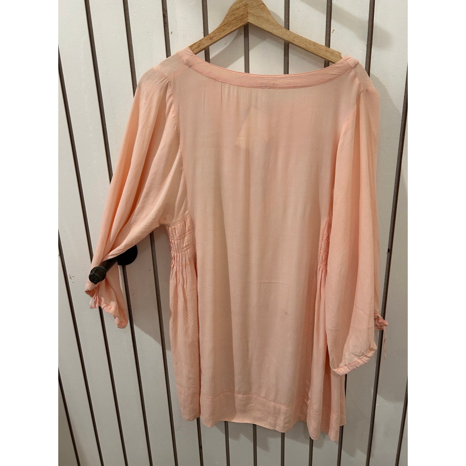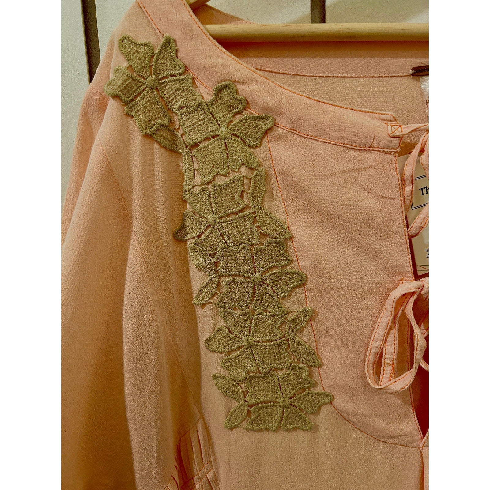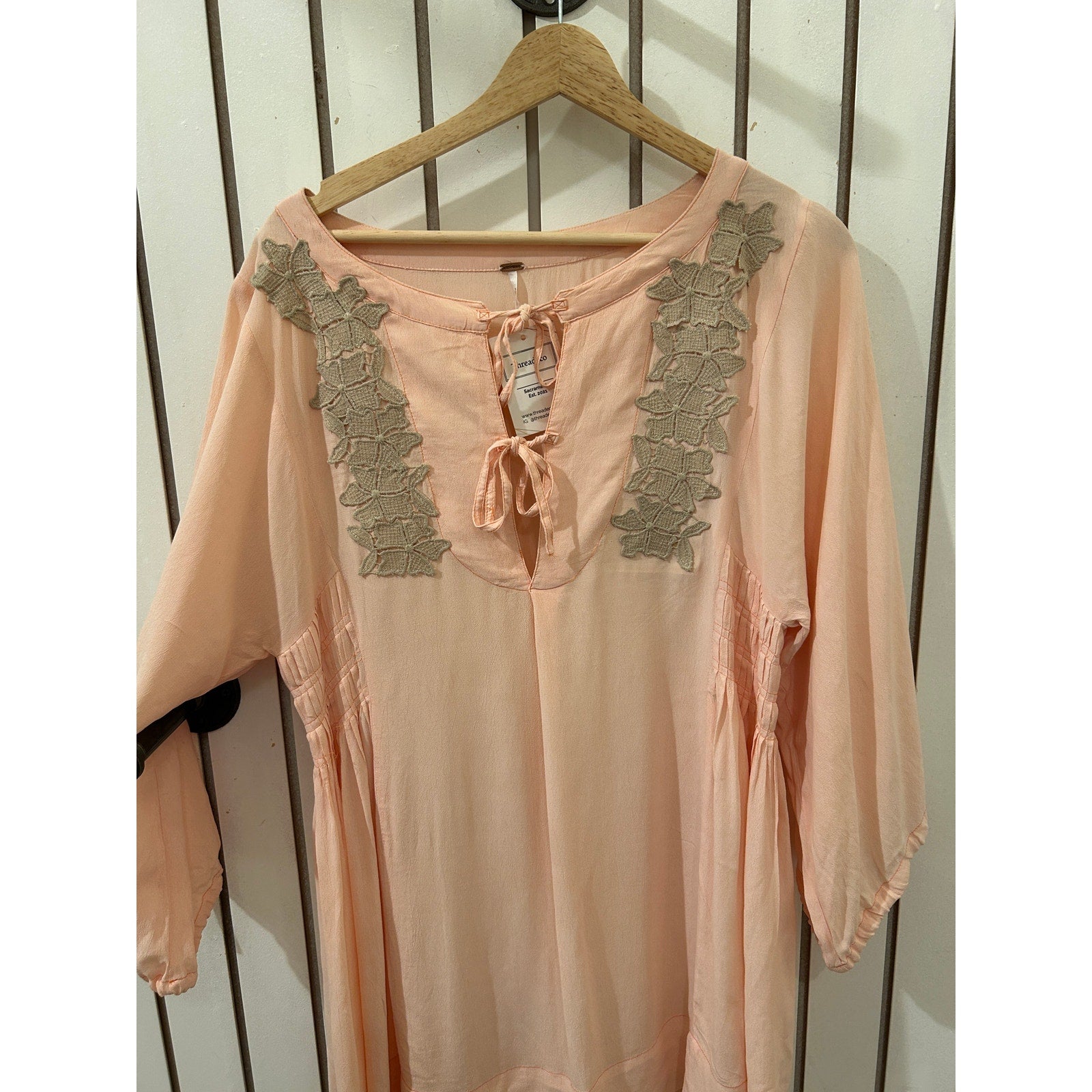 Unique and feminine, this one-of-a-kind Free People blouse in light pink features intricate embellishments for a touch of boho charm. In size XS, it’s perfect for pairing with jeans or skirts for an effortlessly chic look.