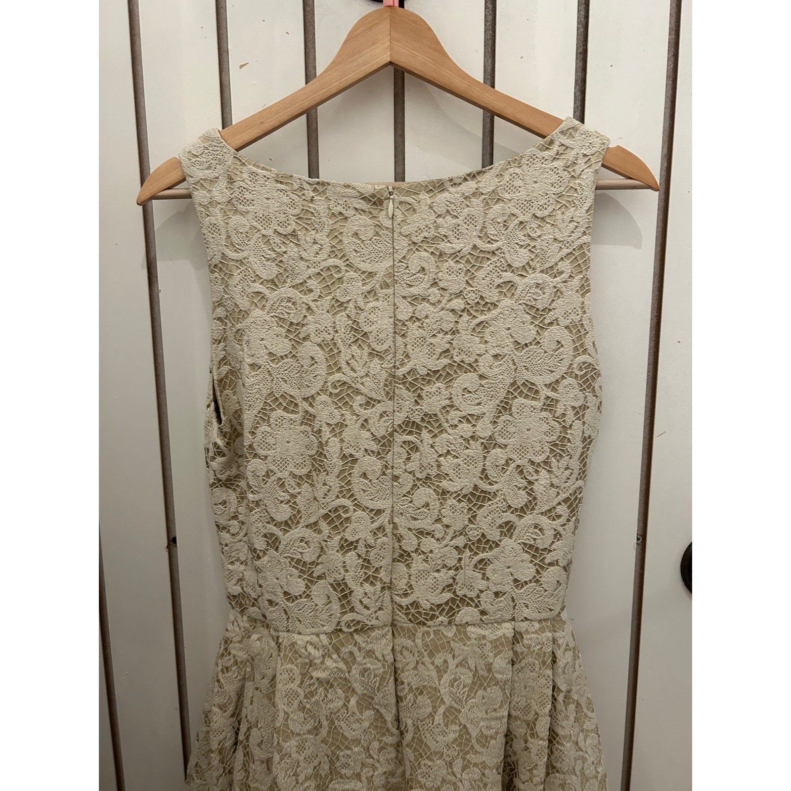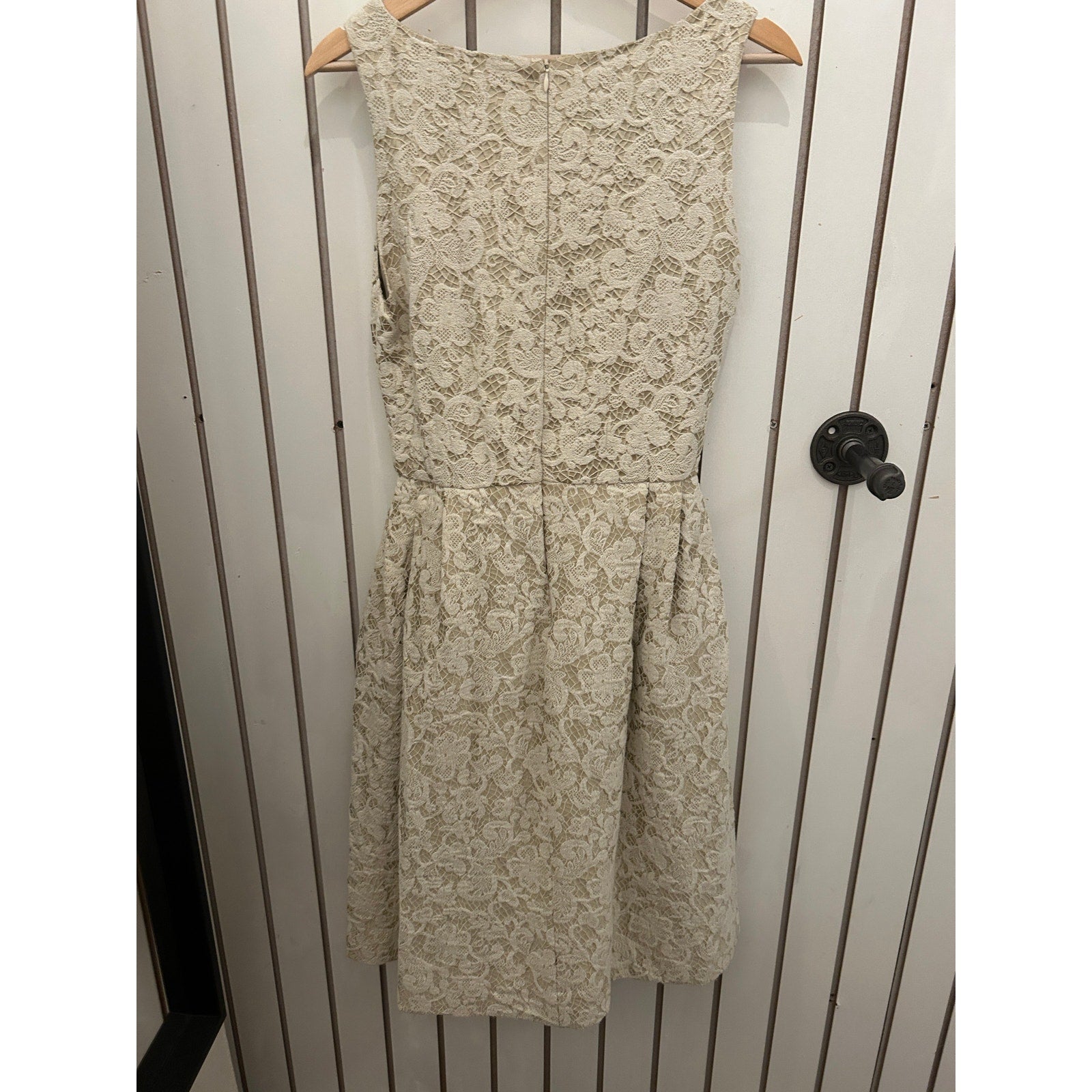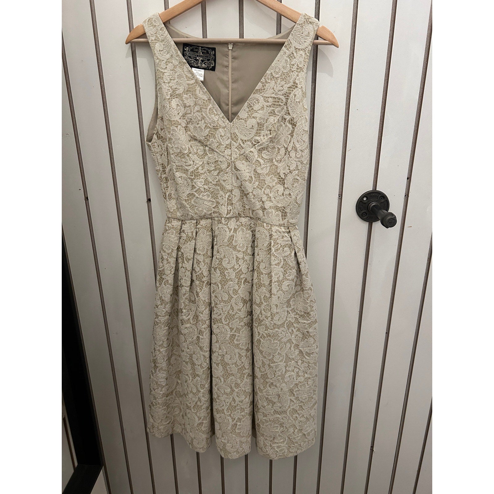 This is a beautiful tan dress from Anthropologie's James Coviello line. The dress features a flattering fit and flare silhouette and an intricate lacey print that adds a touch of elegance. Perfect for a variety of occasions, this dress is sure to turn heads!