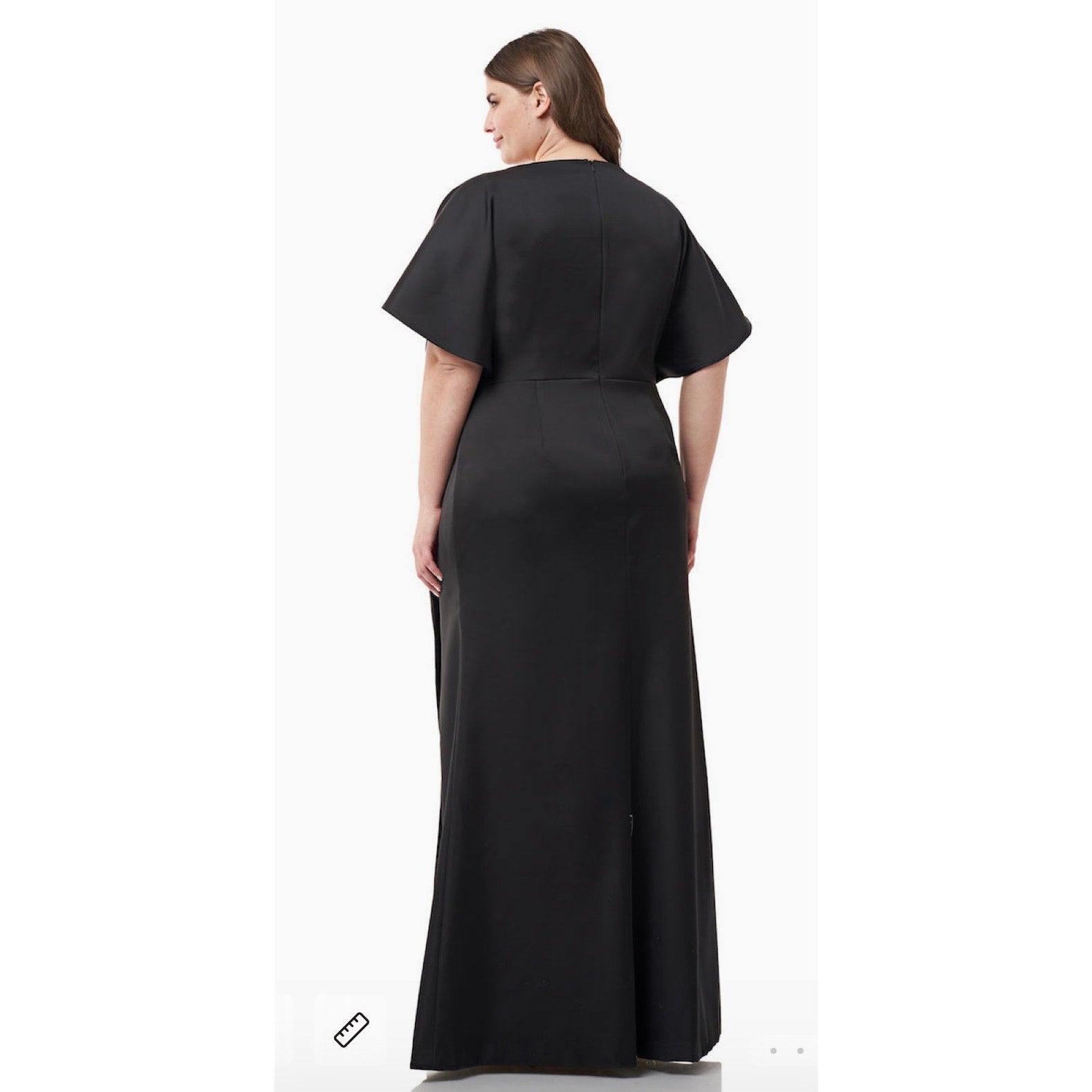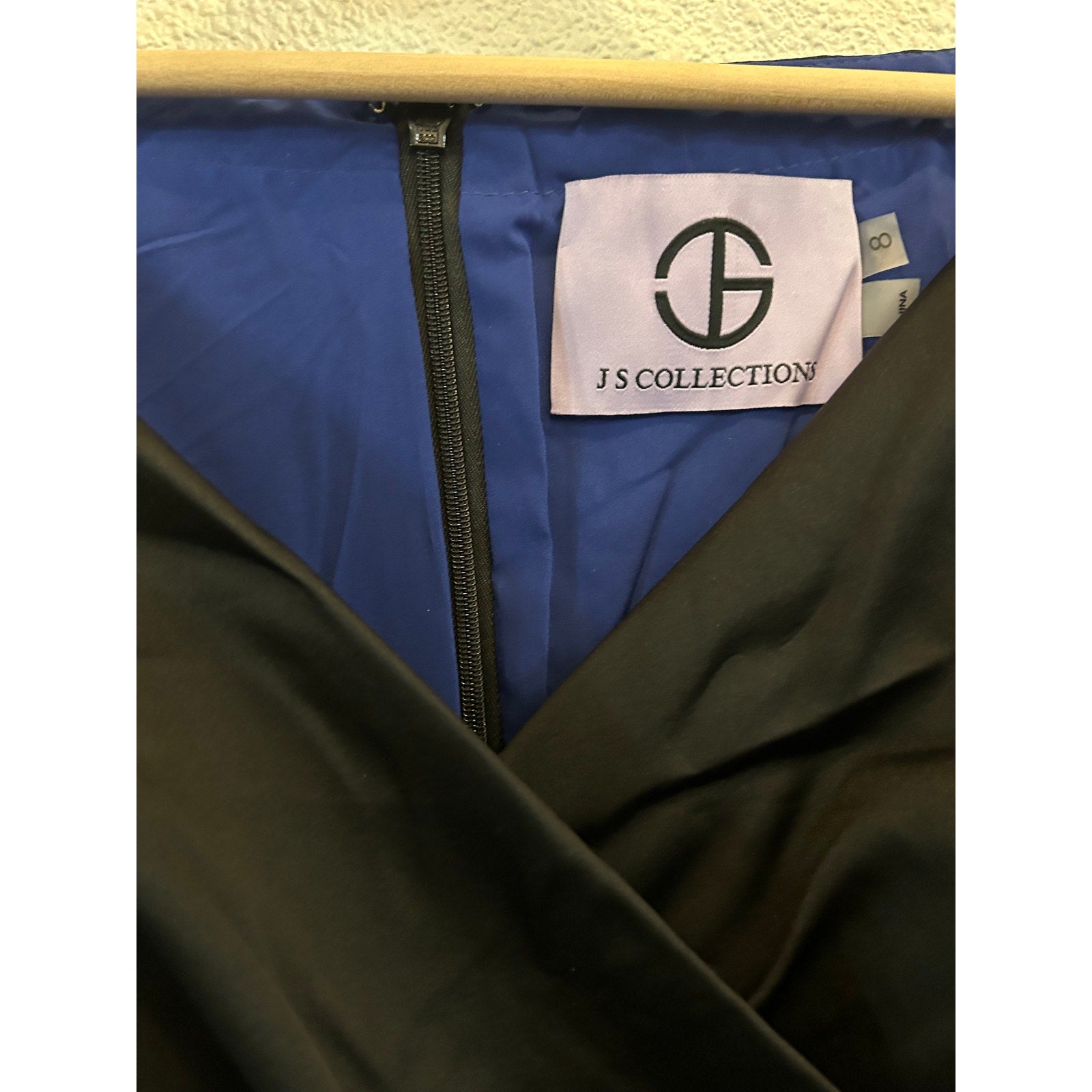 Stunning black JS Collection long dress. Wraps at front with short sleeves and gathers at the waist.