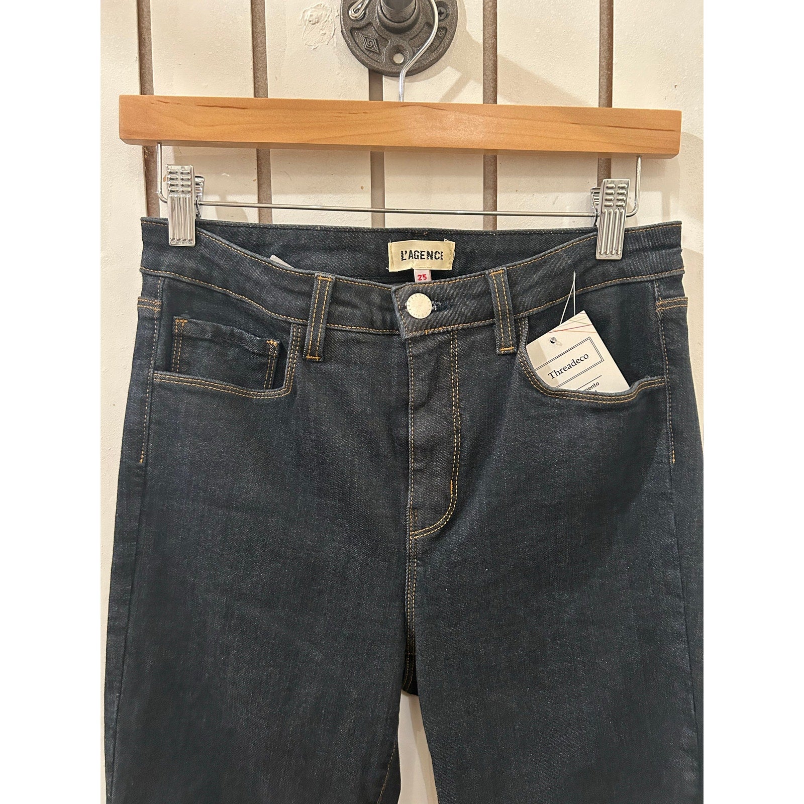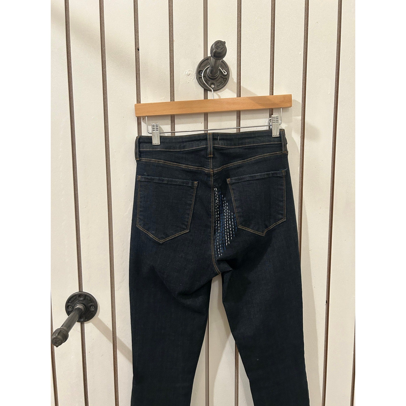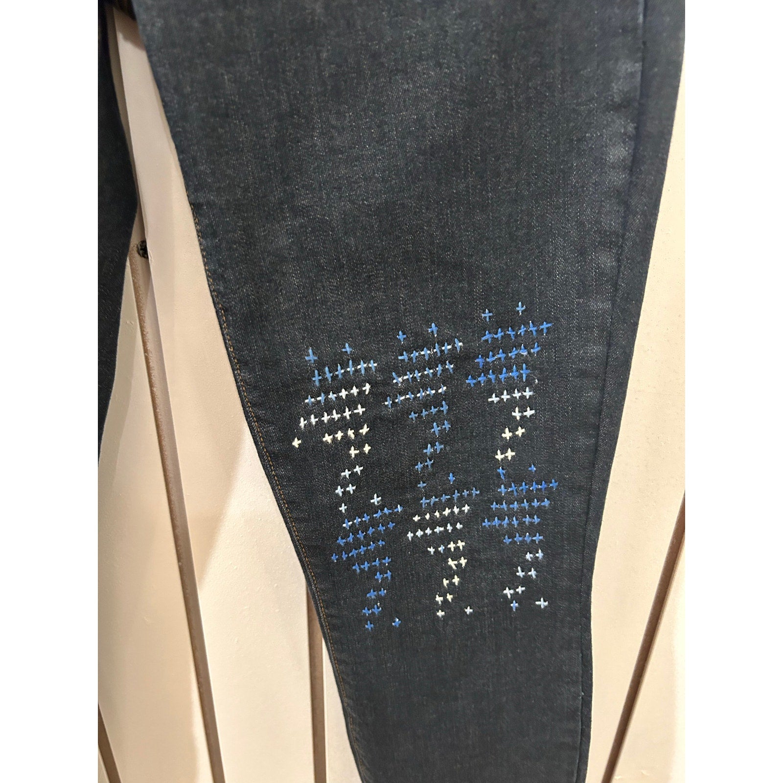 Stunning one of a kind embroidered blue denim jeans size 25. Jeans are designer dark rinse L’Agence and have been transformed with blue embroidery along the knee and back.