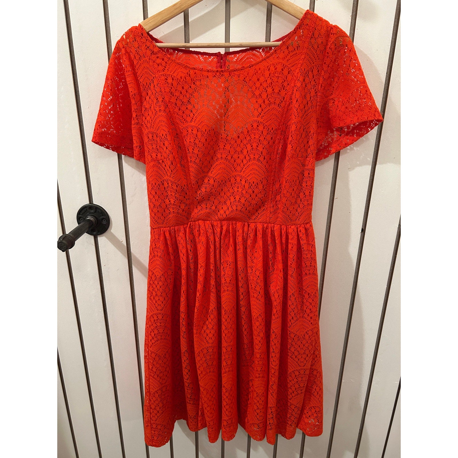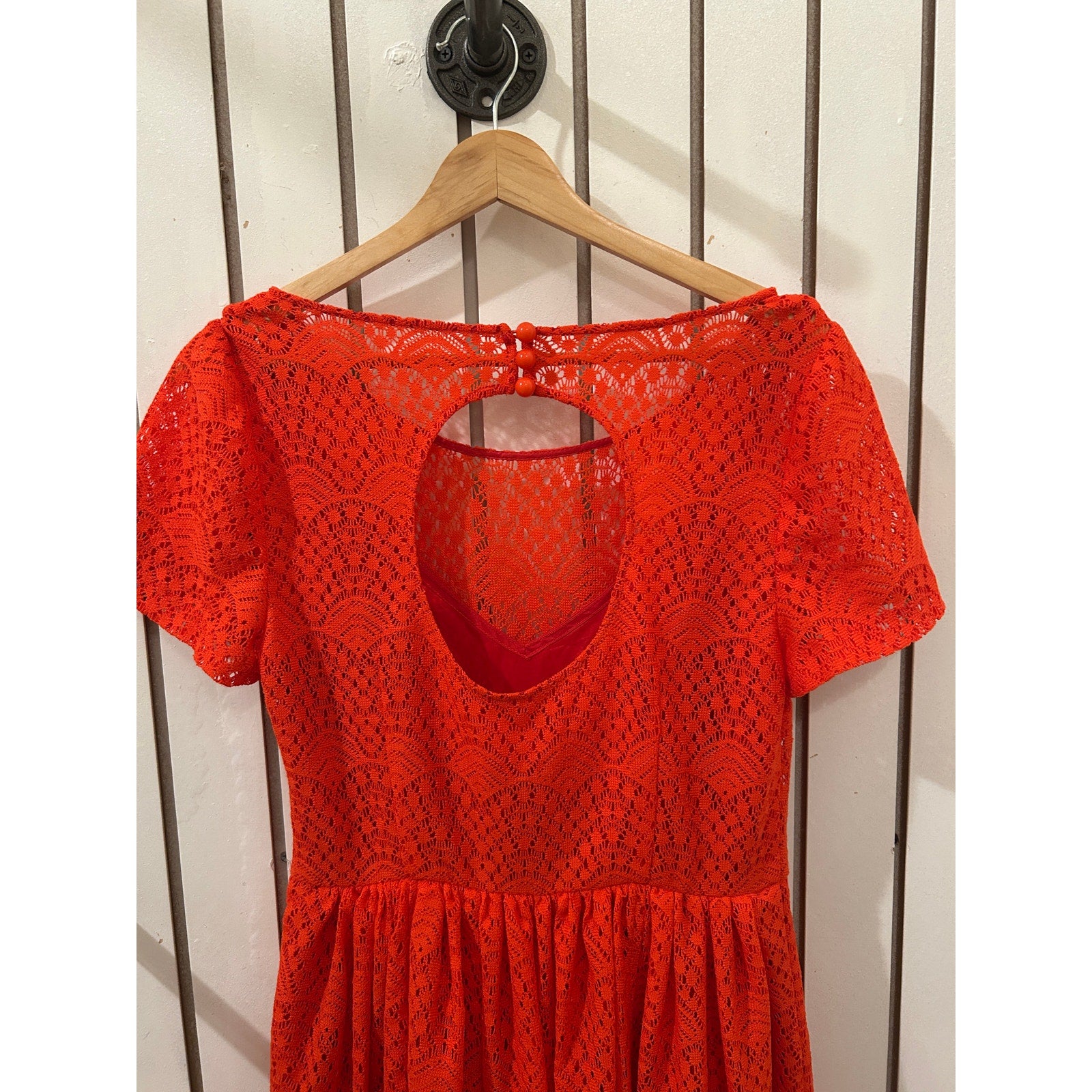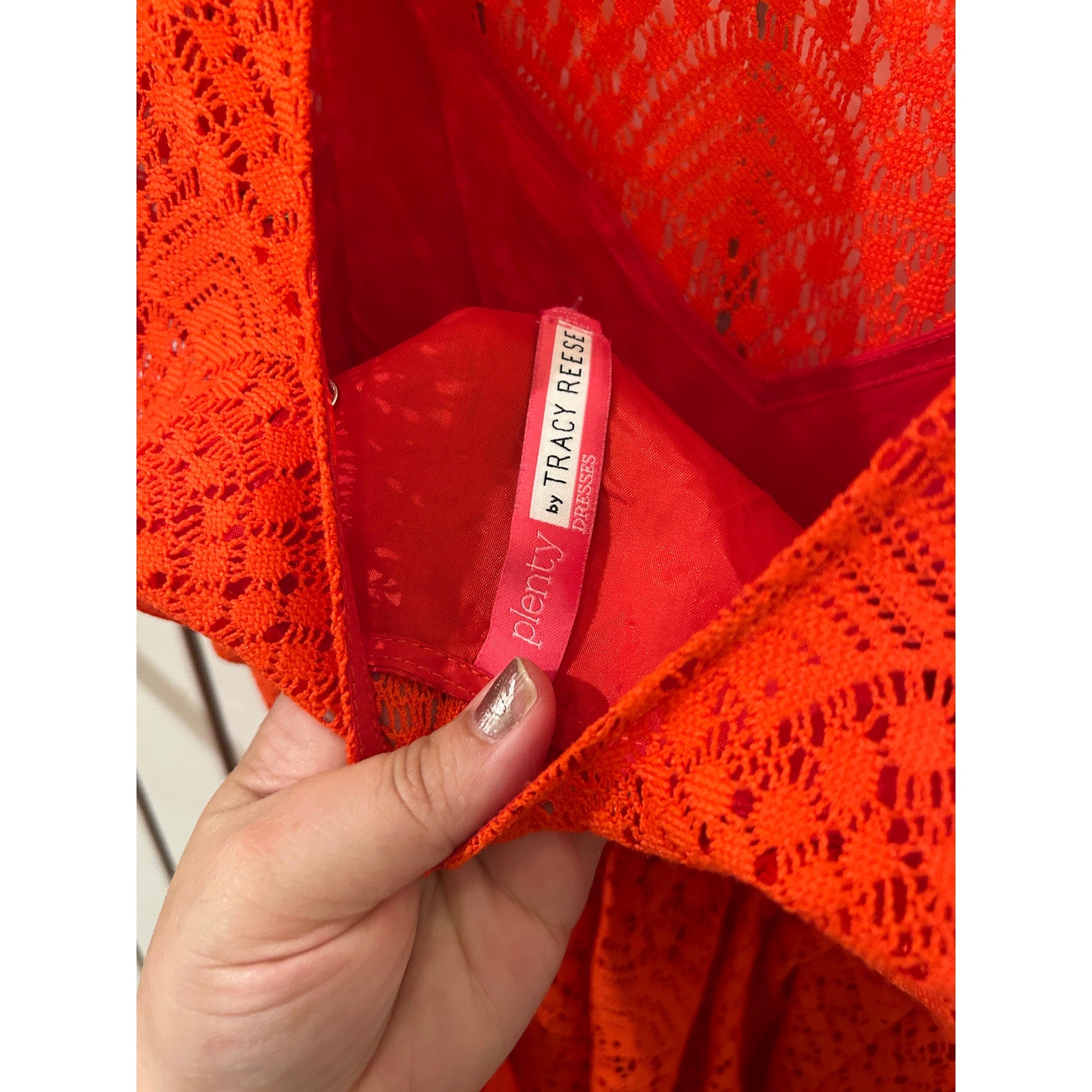 Vibrant and flirty, this Plenty by Tracy Reese dress features bold orange lace and a playful cutout back. Perfect for weddings, parties, or a summer night out, its flattering silhouette and eye-catching details make it a standout piece in any wardrobe.