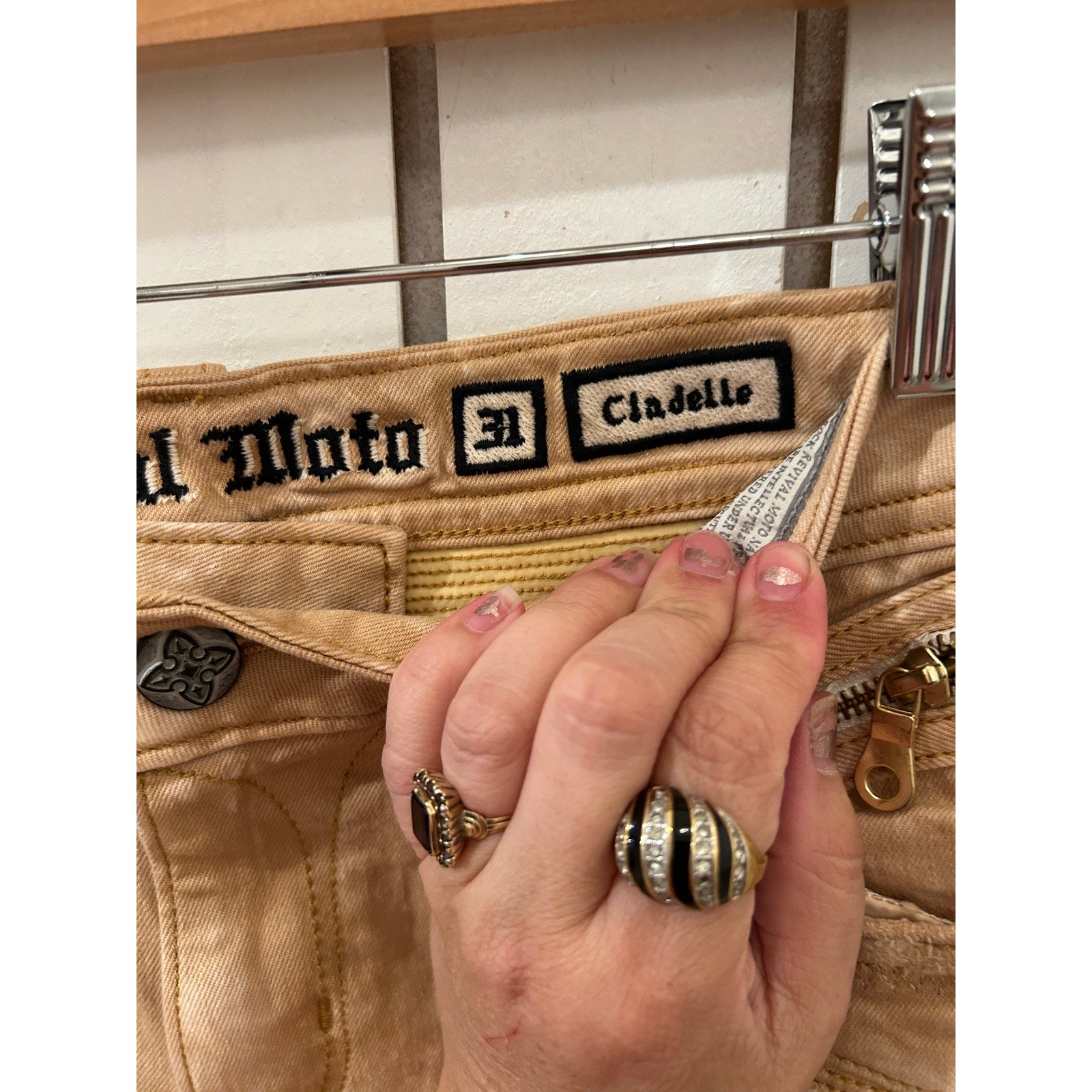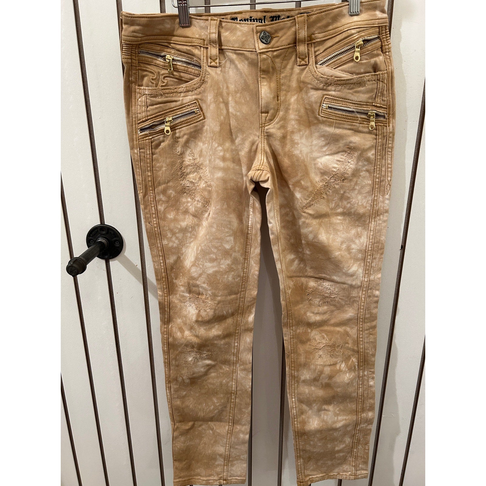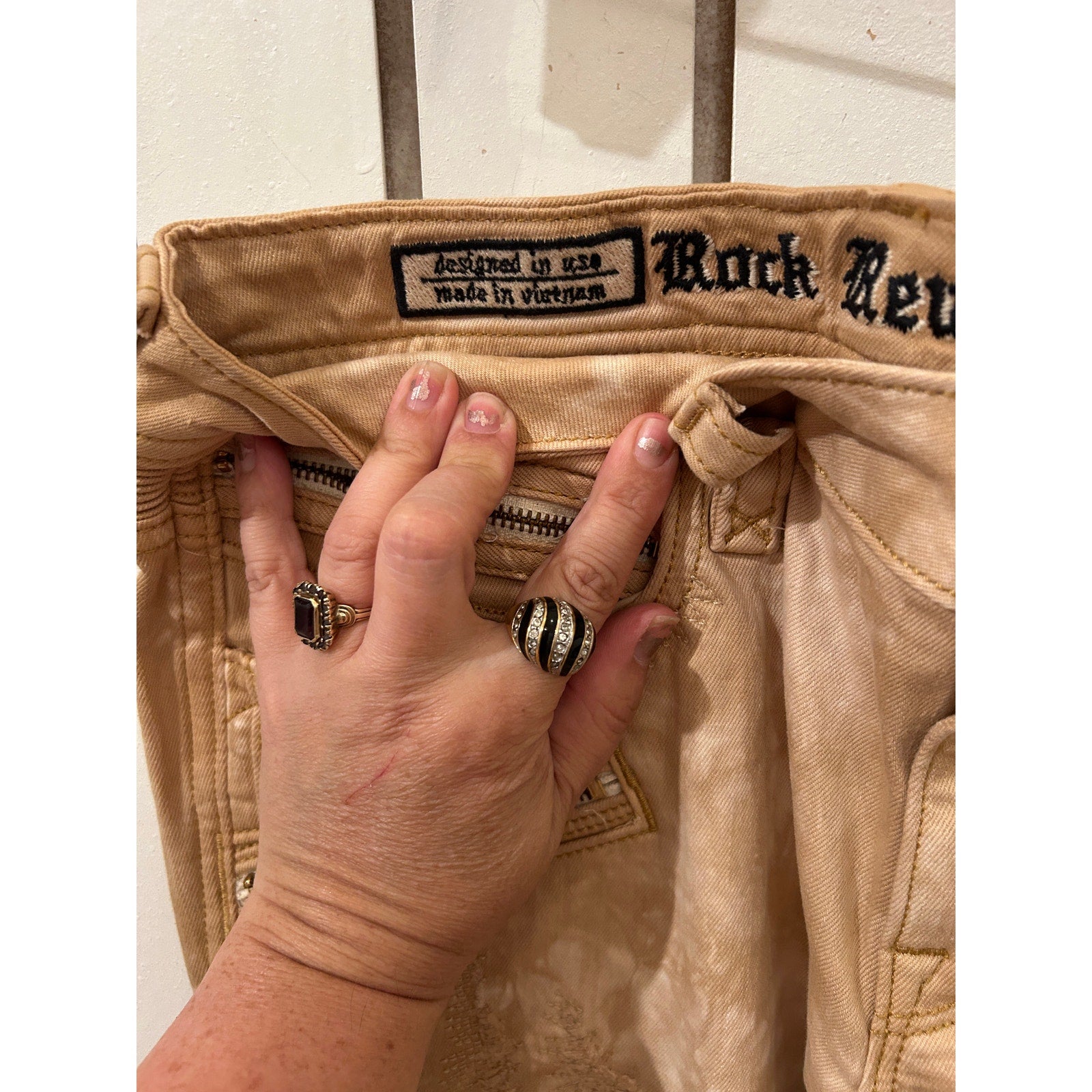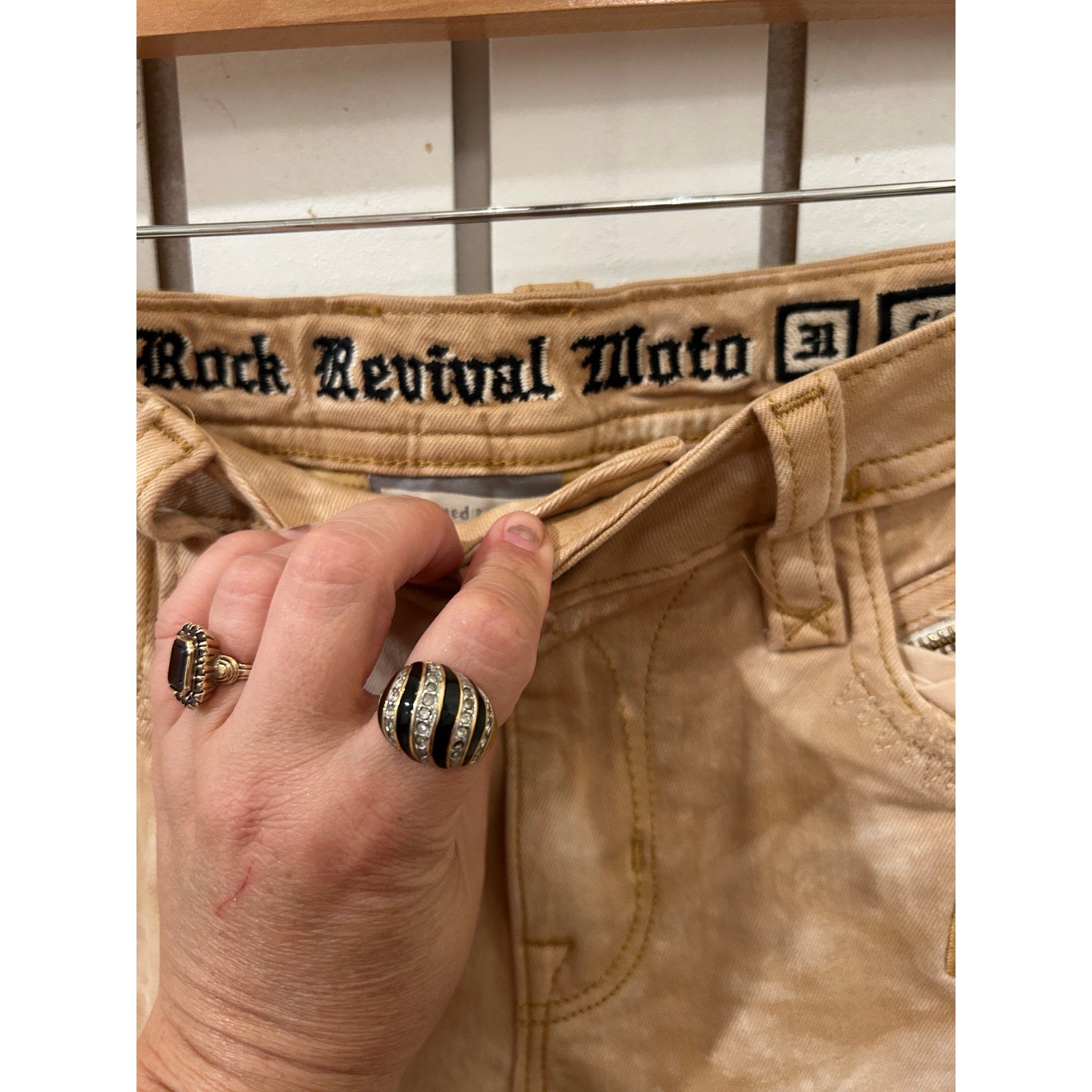Edgy meets sleek in these Rock Revival Moto Jeans in a versatile tan shade. Featuring zipper pockets on the front and back, and a straight leg skinny fit, these size 32 jeans add a bold, moto-inspired touch to your everyday style. Perfect for those who love standout denim with attitude.